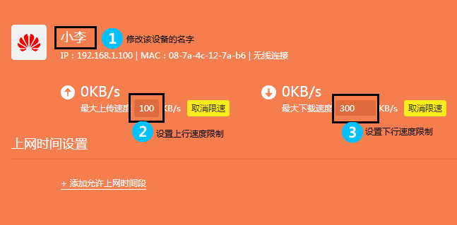 点击终端名字,修改为常用名便于管理。然后点击 限速,分别限制上下行速率的最大值。