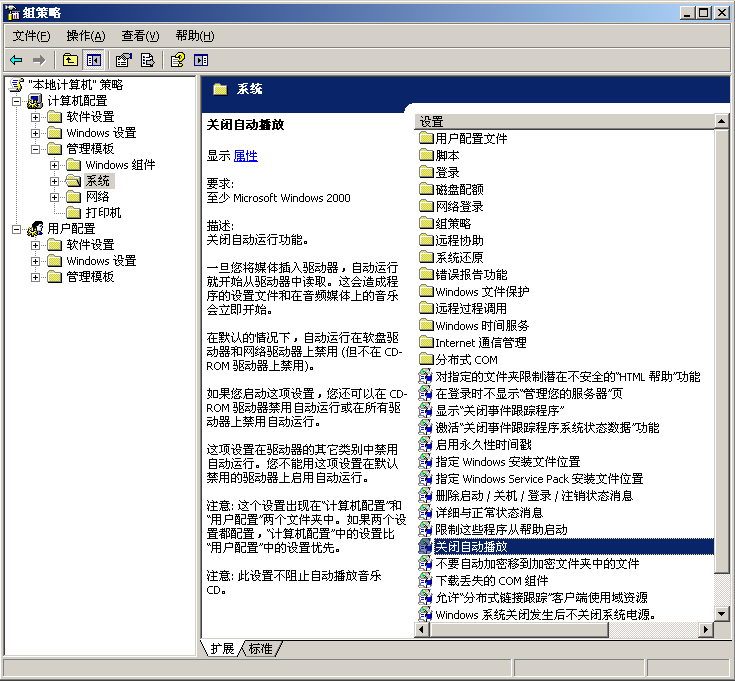 点击电脑的 开始 > 运行, 输入gpedit.msc,点击 确定,打开组策略界面,依次展开左边的 计算机配置 > 管理模板 > 系统,在右边页面找到 关闭自动播放的选项,如下图: