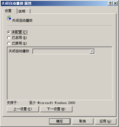 在上图中双击打开 关闭自动播放,在弹出的对话框中选择 未配置 或 已禁用,点击 应用,再点击 确定,如下图: