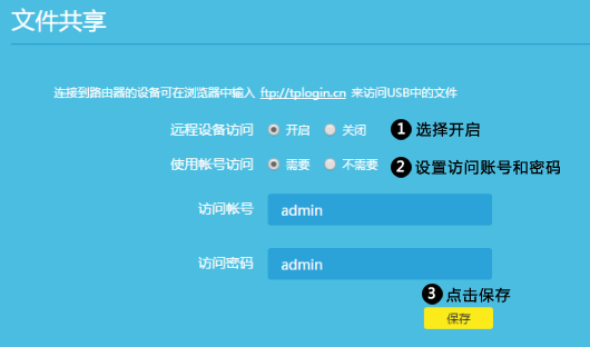 在文件共享界面,远程设备访问 选择 开启。如果设置账号密码(账号密码是自定义设置的),则终端需要输入账号密码才能访问共享文件。请根据实际需要设置,点击 保存,如下图: