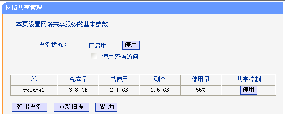 将移动存储设备盘插入路由器的USB接口,且确保路由器上对应的USB指示灯亮,说明存储设备连接正确,此时登录路由器管理界面,在 路由设置 > 文件共享,可以显示连接的存储设备,如下图: