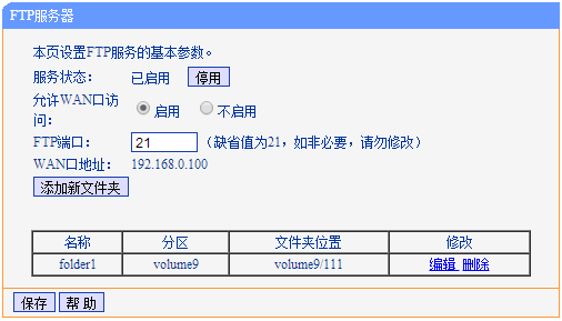 页面回到FTP服务器界面,服务状态 点击 启用,允许WAN口访问 选择 启用,点击 保存,如下图: