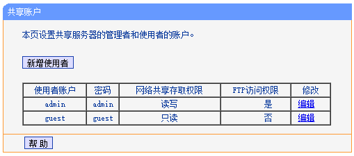系统默认有admin和guest账户,其中admin可以访问FTP服务器,guest账户无法访问,点击 编辑 可以修改访问权限。