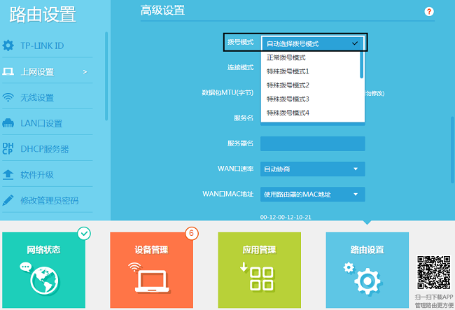 路由器上网设置选择 宽带拨号上网(PPPoE)时,在 高级设置 的 拨号模式 有多种特殊拨号模式,如下图: