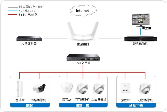 别墅住宅一般庭院面积较大,需要在庭院四角布置摄像机进行无死角监控,同时使用室外AP进行无线覆盖。室内客厅等较开放区域使用吸顶式AP进行无线覆盖,卧室可采用面板式AP。而在别墅门口、车库、阳台等位置需要安装摄像机进行实时监控。
