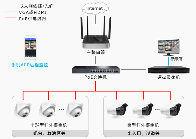 如上图,在酒吧各区域分别安装TP-LINK红外摄像机,实时监控人员流动情况;拓扑中使用PoE交换机通过网线为PoE IPC(网络摄像机)供电,可以避免额外布线。本方案支持远程监控。