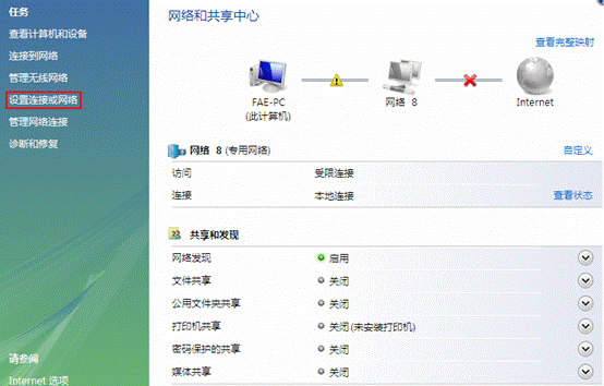 1)、点击任务栏“开始”→“控制面板”→“网络和Internet”→ “网络和共享中心”,点击“设置连接或网络”图标。