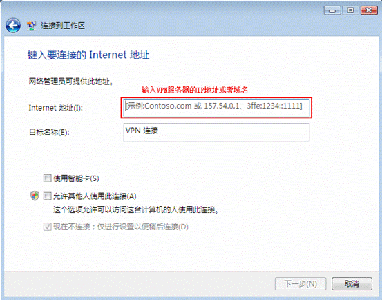 5)、“键入要连接的Internet地址”中输入服务器的IP地址或者域名。