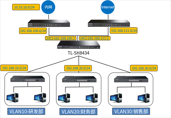 路由器的策略路由功能想必大家都不陌生;下面小商以实际的需求案例,以TL-SH8434作为核心交换机教大家如何具体配置交换机的策略路由功能,示意网络拓扑如下:
