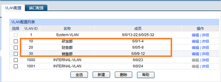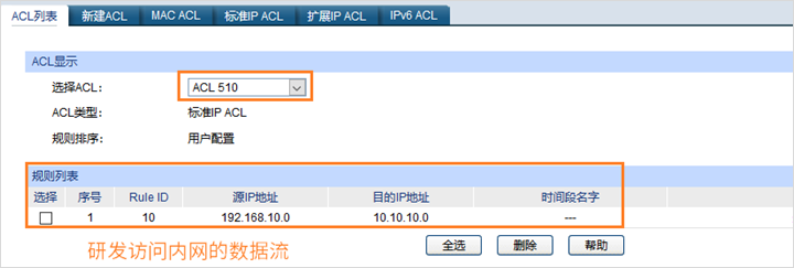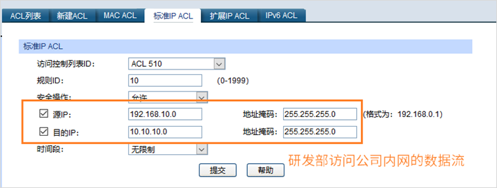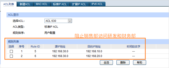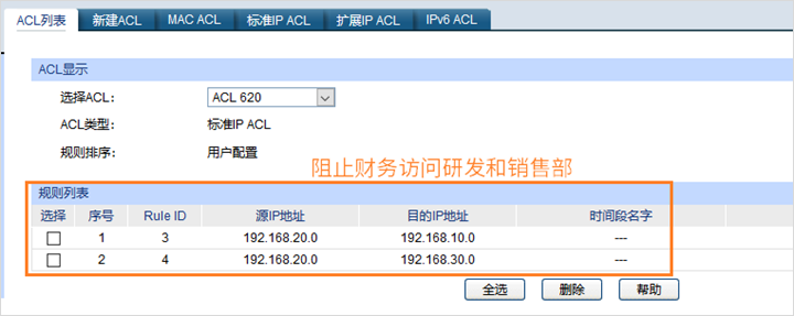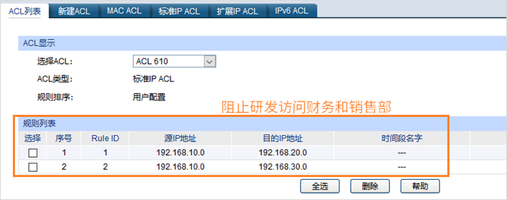 (2) 不同部门不能够互访可以通过设置ACL规则来实现;