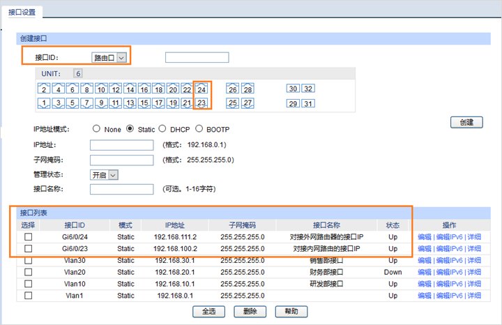 配置交换机的路由口地址,对接不同出口路由器,在交换机Web界面:“路由功能”—“接口”—“接口ID”--“路由口”,配置23端口对接内网路由的接口IP和24端口对接外网路由器的接口IP: