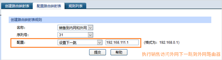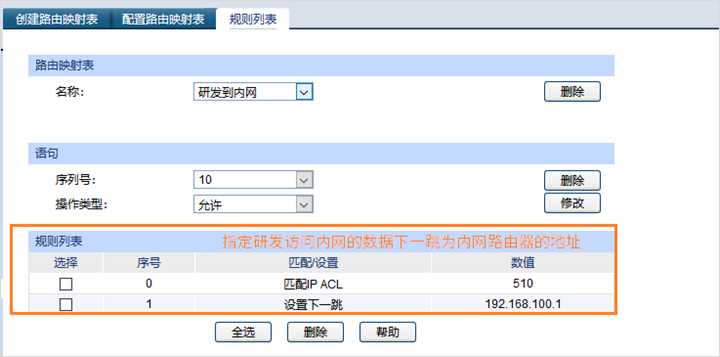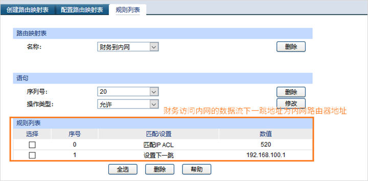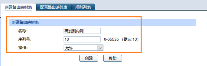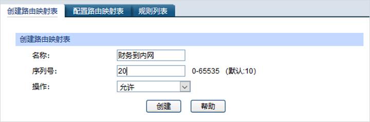 指定策略路由的条目名称,后续用此条目绑定对应的VLAN接口,使能接口,在交换机Web界面:“路由功能”—“路由映射表”—“创建路由映射表”,此处创建三条路由映射表分别为:研发到内网,财务到内网和销售到内网和外网三条条目: