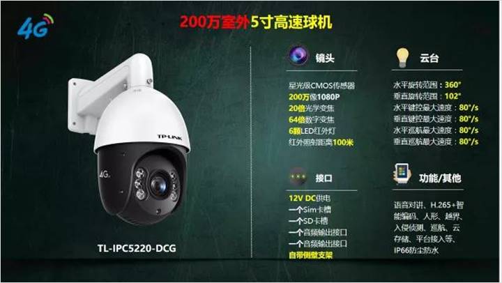 针对野外、山区、工地等大场景,需要进行远距离监控以及多个重点监控区域的自动巡航监控,可以使用这款内置4G模块的200万室外5寸红外高速球机---TL-IPC5220-DCG,插入4G卡自动联网,搭配星光镜头、20倍光学变焦、360°云台、巡航和H.265+智能编码等软硬件功能,实现监控范围广、消耗流量少和图像效果佳。