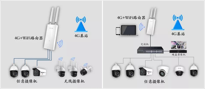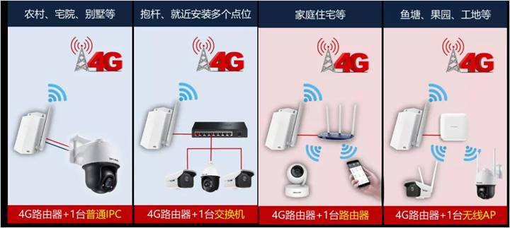 如果针对其它场景,需要用到其它型号非内置4G模块的摄像机,且无宽带上网,可以使用非4G摄像机搭配4G路由器进行远程监控。目前已推出两款4G路由器:室外防水4G路由器和室外防水4G无线路由器。